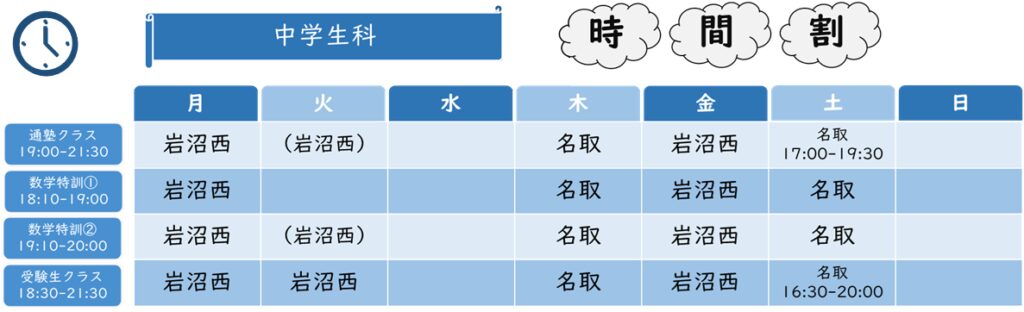 名取校が木曜・土曜 ※岩沼西校を活用して週3以上の通塾もOK